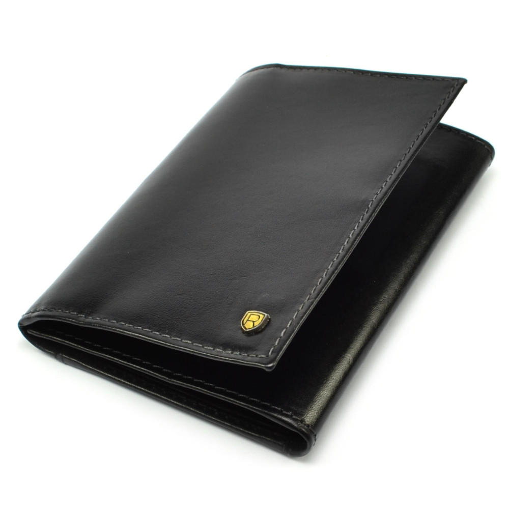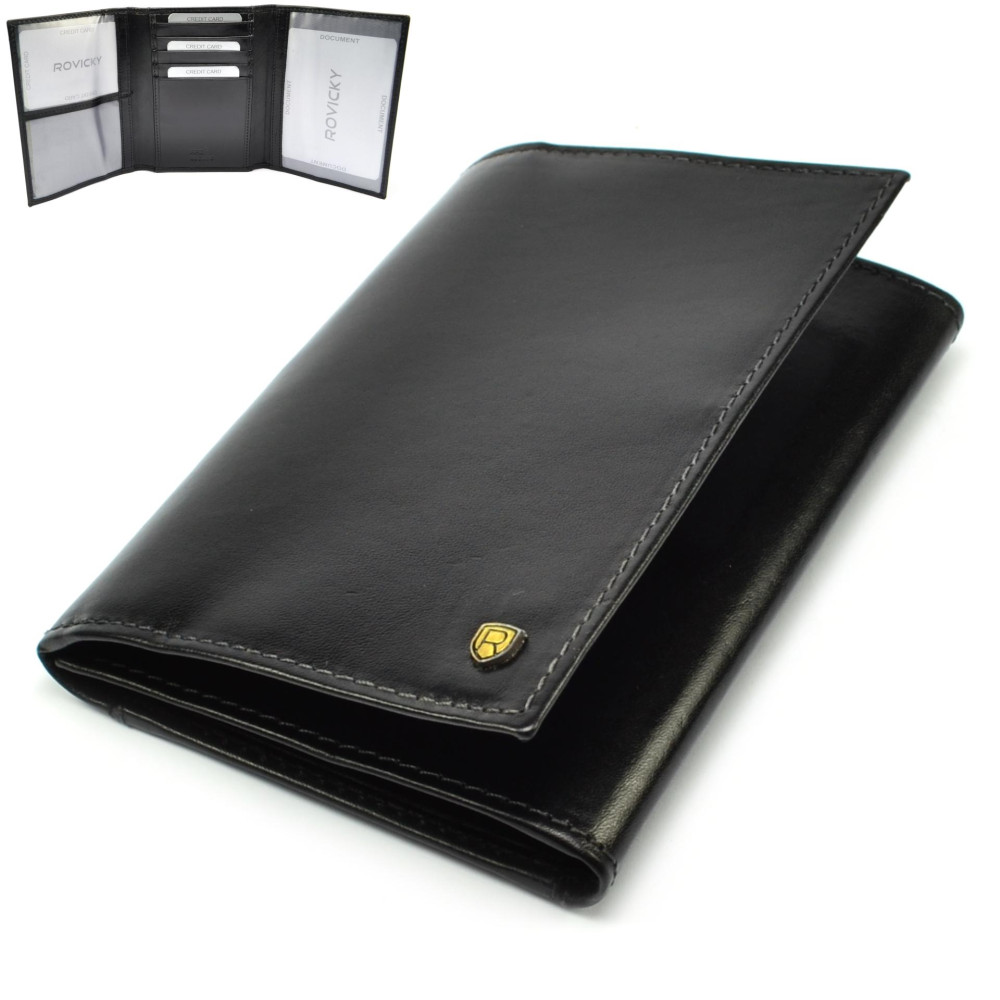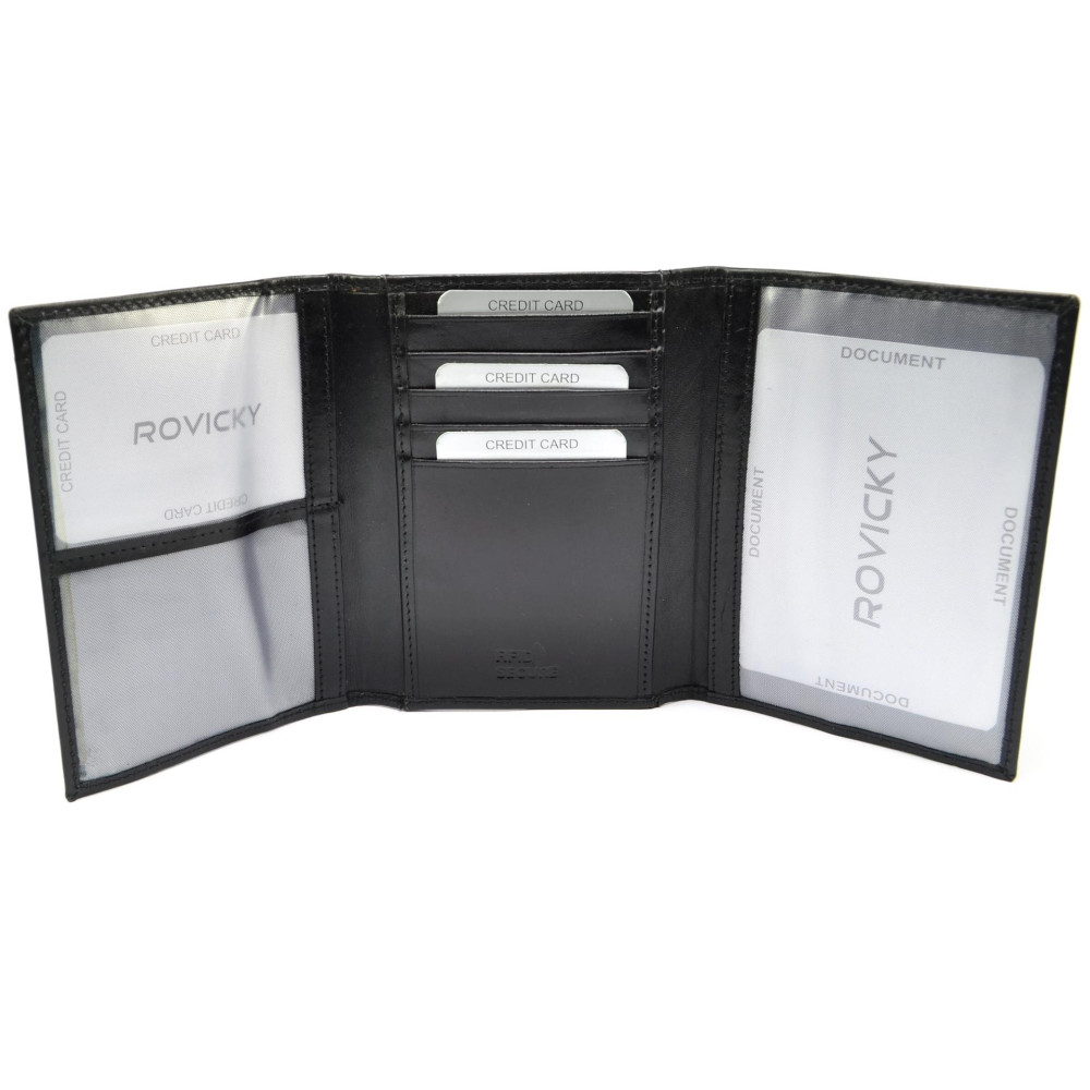 Černé pouzdro na platební karty kožené má dostatek kapes na karty, některé jsou průhledné. Pouzdro je vyrobeno z pravé kůže černé barvy a je značky Rovicky.