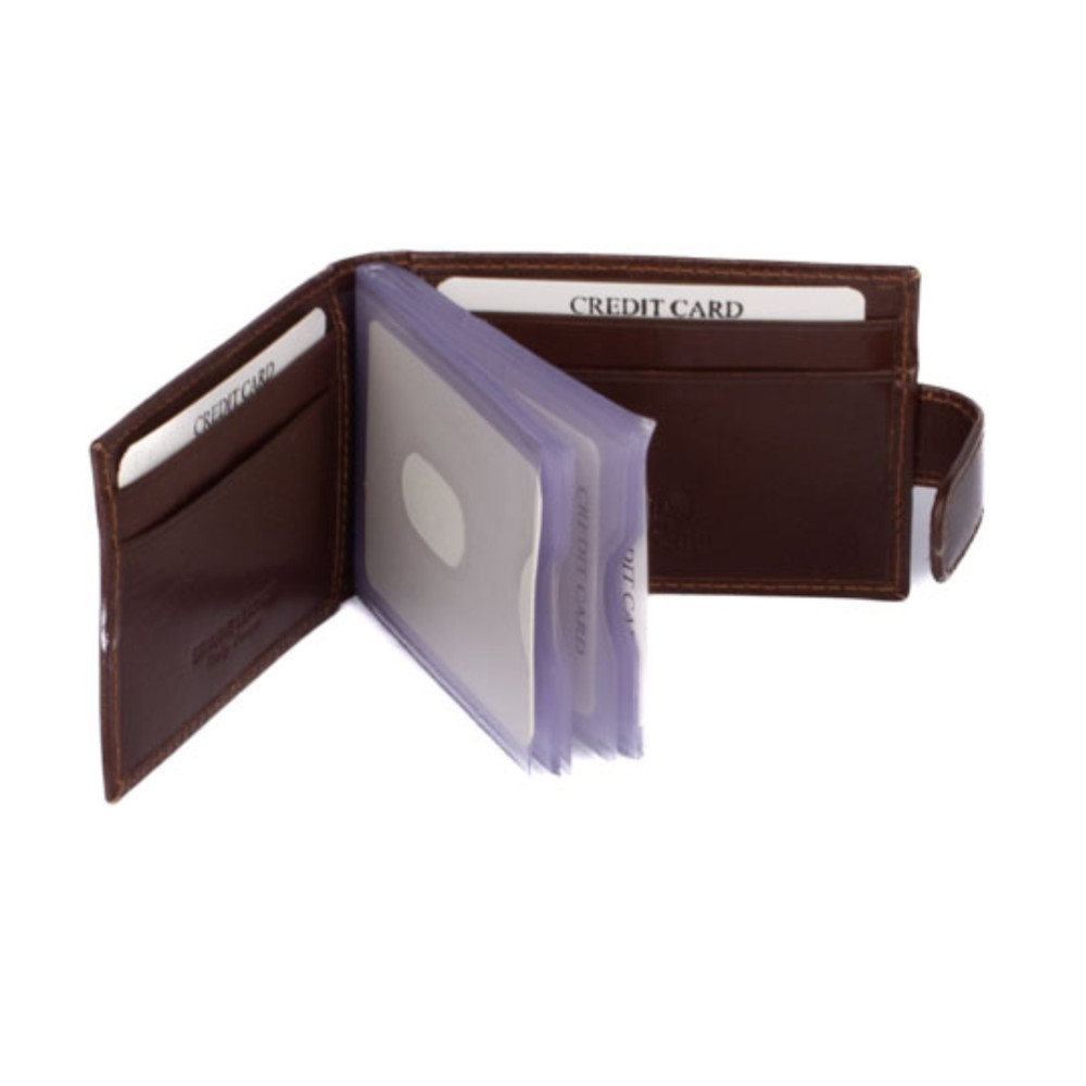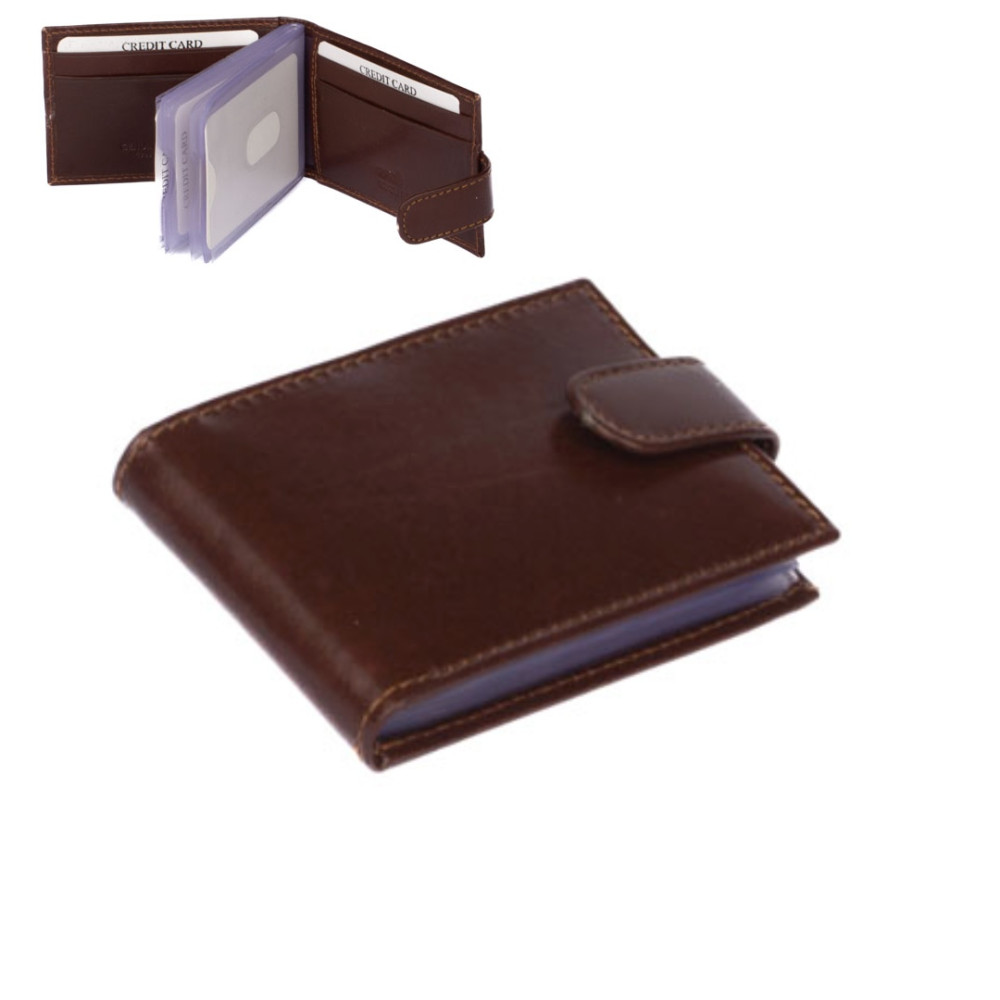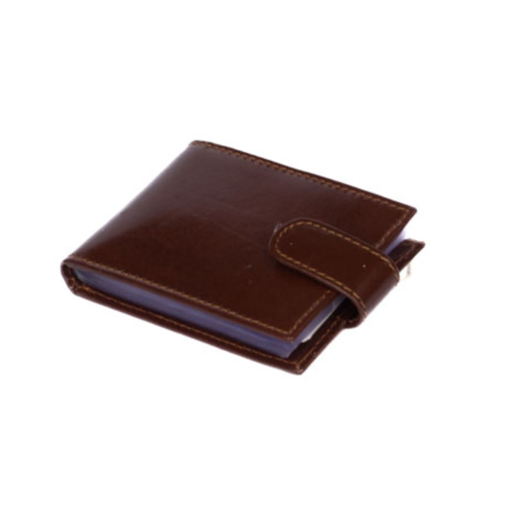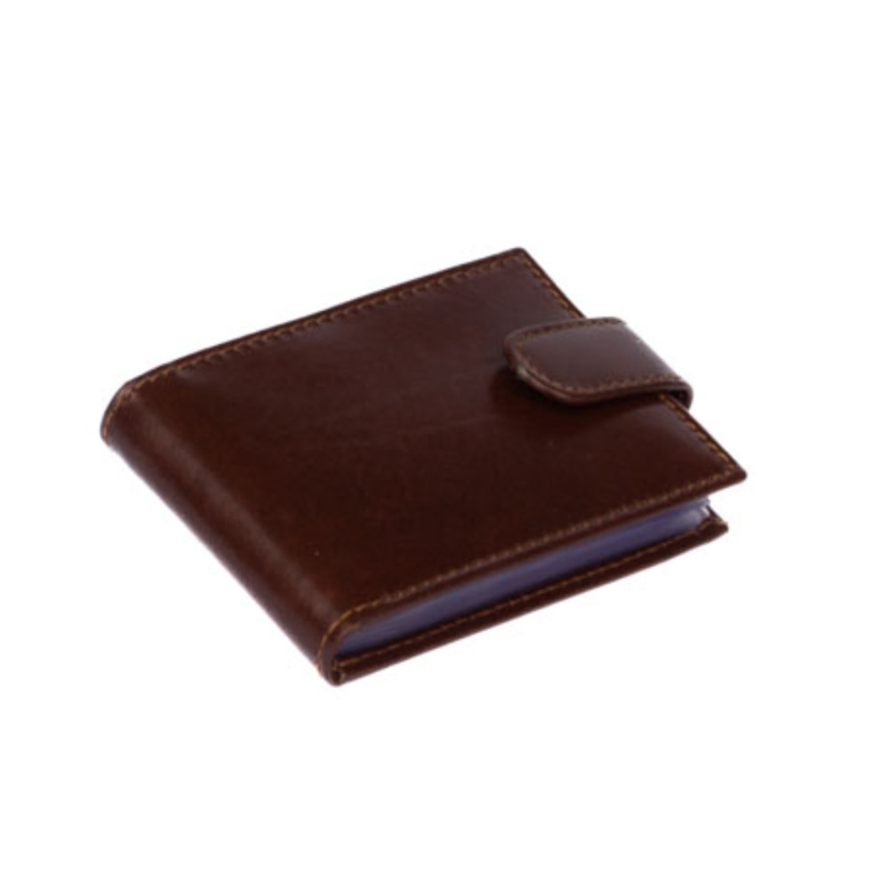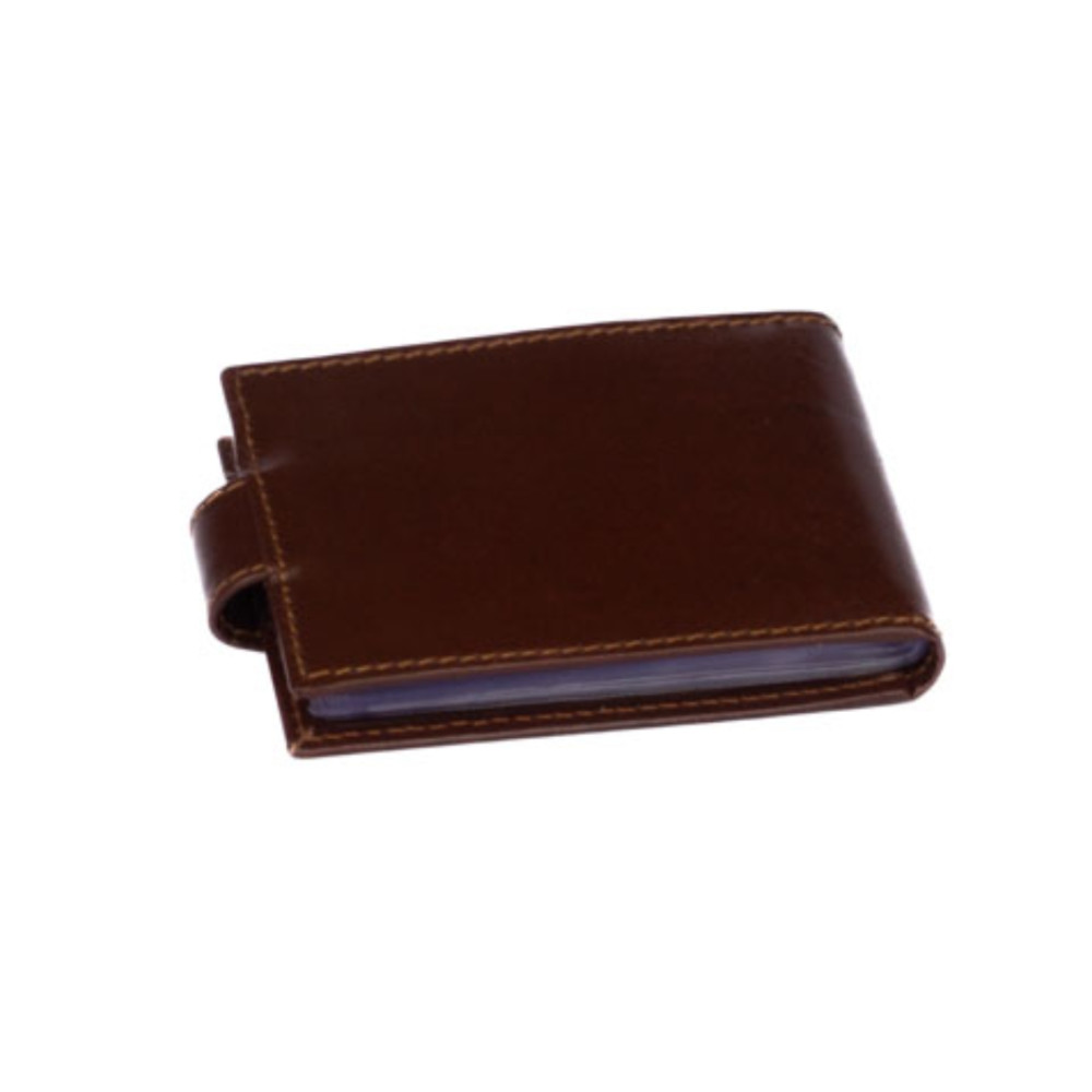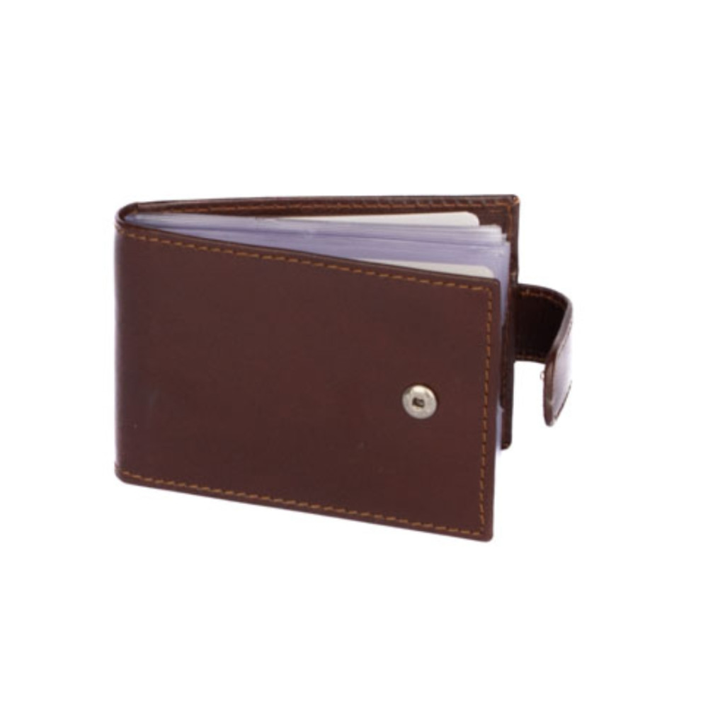 Kožené pouzdro na vizitky a karty se uzavírá přezkou s pevným drukem. Uvnitř pouzdra je dostatek kapes na vizitky nebo platební a jiné karty z fólie. Po stranách pouzdra jsou kožené kapsy. Pouzdro je vyrobené z pravé kůže hnědé barvy a je bez loga značky. Do pouzdra je možné uložit 20 vizitek nebo 8 karet. Pouzdro je dodáváno v krabičce.