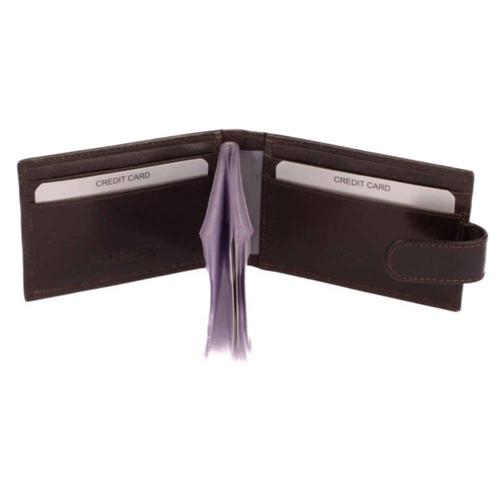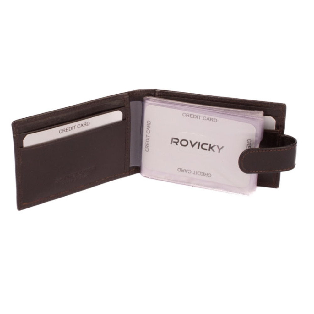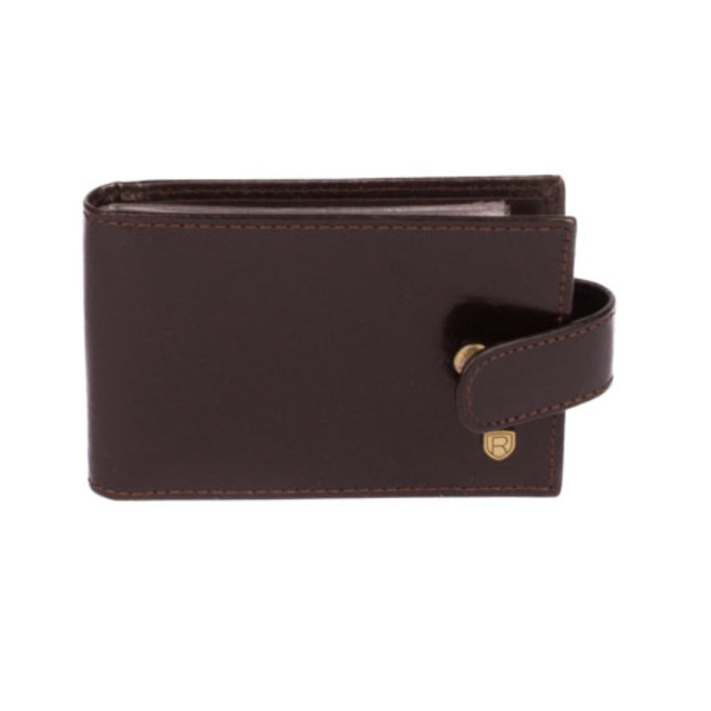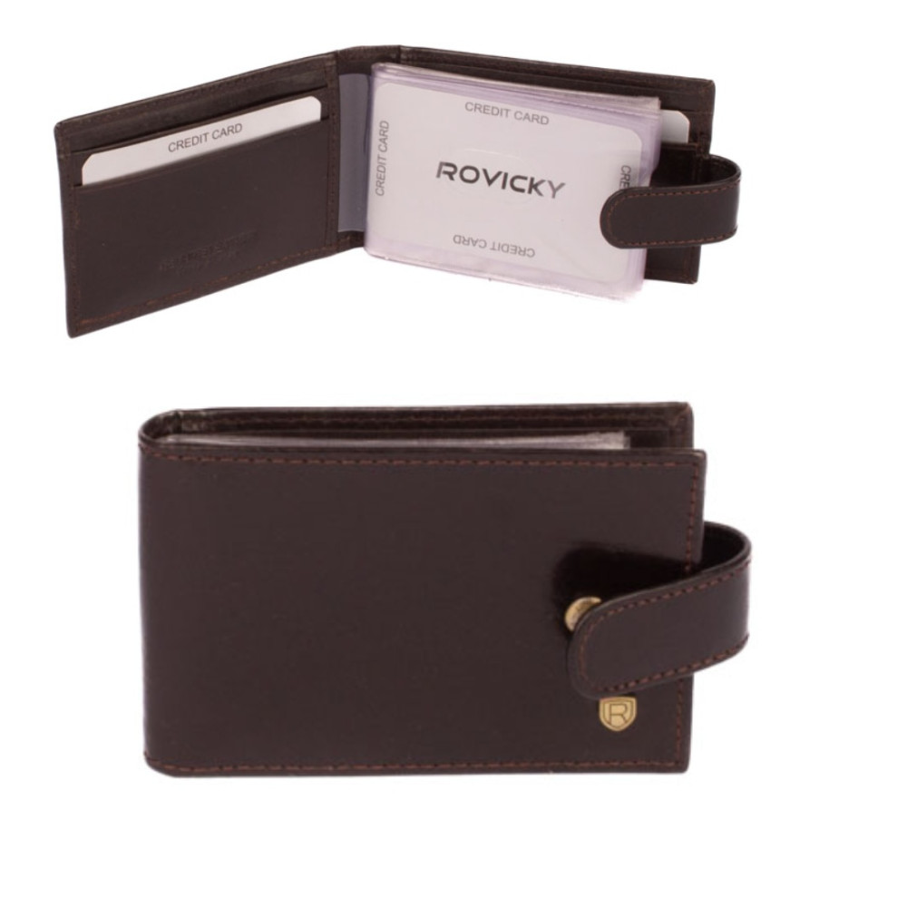 Kožené pouzdro na vizitky a karty se uzavírá přezkou s pevným drukem. Uvnitř pouzdra je dostatek kapes na vizitky nebo platební a jiné karty z fólie. Po stranách pouzdra jsou kožené kapsy. Pouzdro je vyrobené z pravé kůže hnědé barvy a je bez loga značky. Do pouzdra je možné uložit 16 karet. Pouzdro je dodáváno v krabičce.