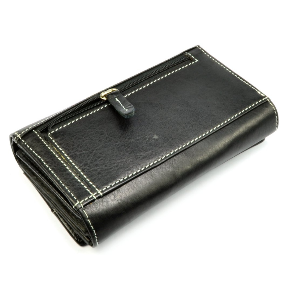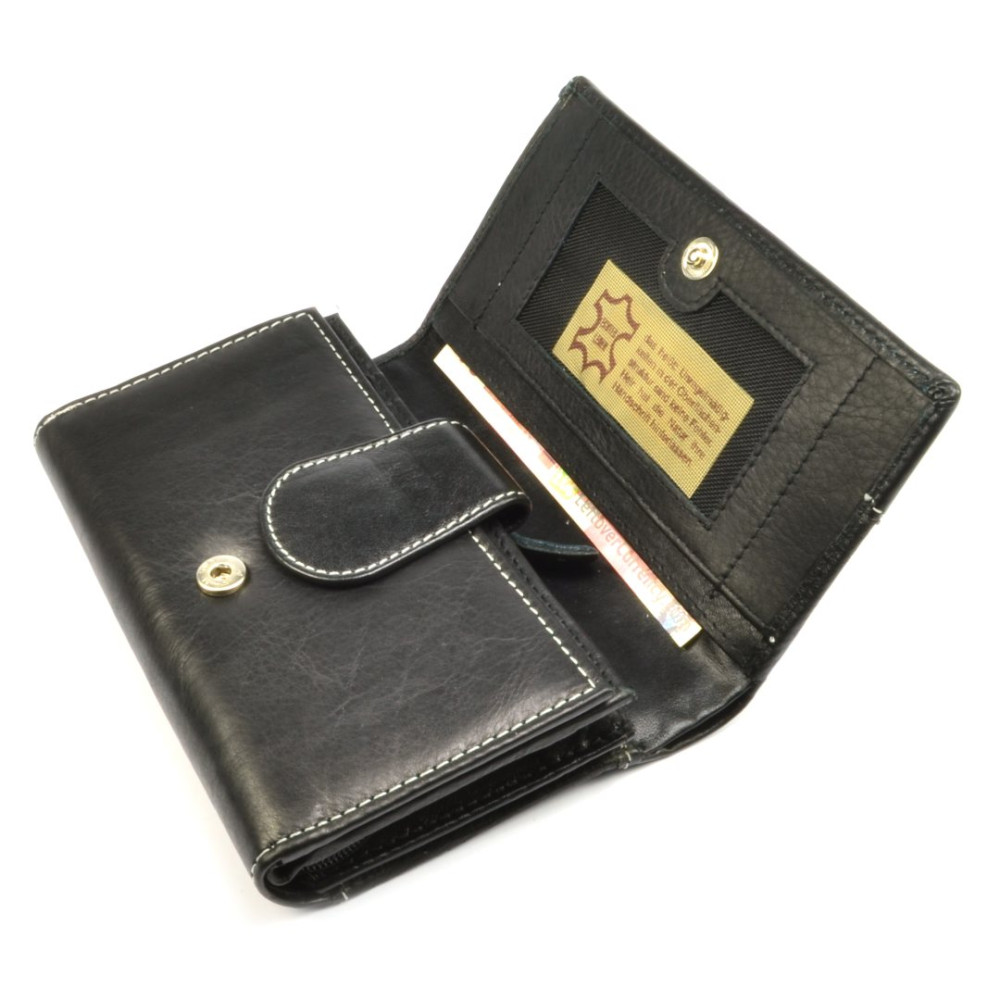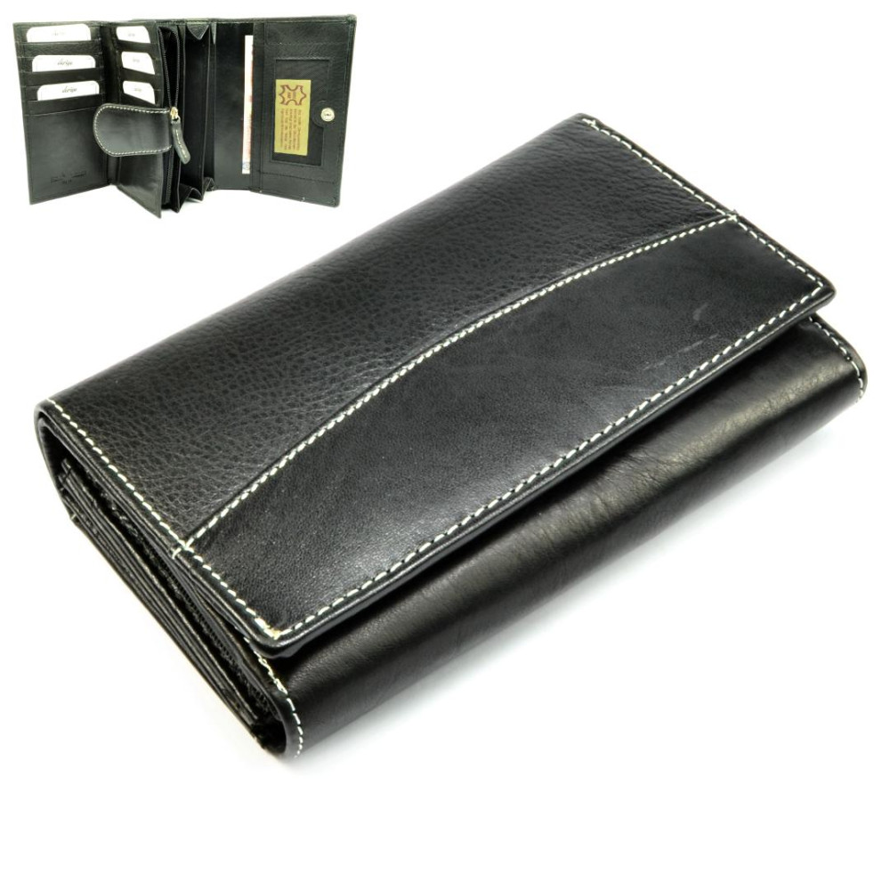 Pokud máte raději větší peněženky je tato černá dámská peněženka jasná volba. Peněženka se uzavírá klopou s pevným drukem. Po otevření peněženky jsou přístupné tenké kapsy, jedna z nich je průhledná, kapsy na bankovky a mincovník. Ten je rozdělený na dvě velké kapsy a uzavírá se zipem s velkým jezdcem pro pohodlné otvírání. Pod přezkou uvnitř peněženky jsou kapsy na karty. Přes celou šířku peněženky je jedna velká kapsa na bankovky, přístupná z horní části peněženky. Na zadní straně peněženky je menší kapsa na zip. Peněženka je vyrobená z pravé kůže černé barvy.